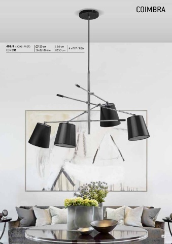 COIMBRA 408/4 CROMO+PRETO 20 cm L 80 cm 4 x E27 / 60W COR 591 16x12x16 cm H150 cm 408/M2 CROMO+PRETO 20 cm 70 cm 2 x E27 / 60W COR 591 16x12x16 cm 408/PÉ CROMO+PRETO 30 cm L 70 cm 2 x E27 / 60W COR 591 16x12x16 cm H173 cm 128 129