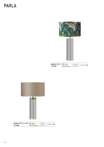 PARLA GIRONA 422/M CROMO / BRANCO 20 cm H 51 cm COR 638 40x40x25 cm H 71 cm 1 x E27 / 60W 423/M CROMO 20 cm H 51 cm 1 x E27 / 60W COR 637 40x40x25 cm H 71 cm 421/M CROMO C/ OURO 20 cm H 51 cm 1 x E27 / 60W COR 600 40x40x25 cm H 71 cm 174 175