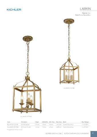 KL-LARKIN-P-S-PNBR 2lt Small Pendant 375mm 203mm 432mm 2261mm* 1 Painted Natural Brass 2 x E14 40W