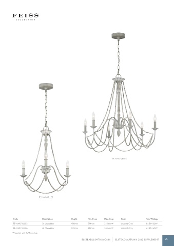FE-MARYVILLE3 3lt Chandelier 498mm 594mm 2160mm* 1 Washed Grey 3 x E14 60W