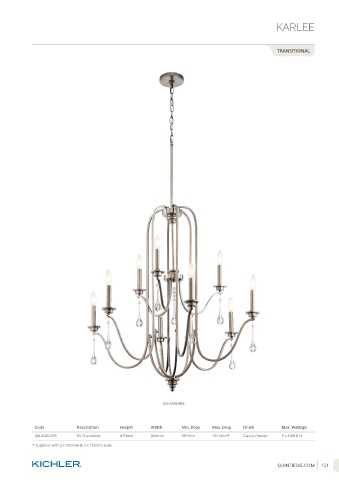 KARLEE TRANSITIONAL QN-KARLEE9 Code Description Height Width Min. Drop Max. Drop Finish Max. Wattage QN-KARLEE9 9lt Chandelier 870mm 864mm 997mm 1912mm* Classic Pewter 9 x 60W E14 * Supplied with 2 x 305mm & 2 x 152mm rods. QUINTIESSE.COM 151