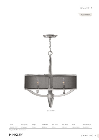 ASCHER TRANSITIONAL QN-ASCHER-3P Code Description Height Width/Dia. Min. Drop Max. Drop Finish Max. Wattage QN-ASCHER-3P 3lt Pendant 590mm Ø539mm 673mm 3749mm* Polished Nickel 3 x 60W E14 * Supplied with 3048mm of chain. QUINTIESSE.COM 161