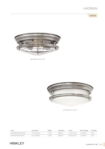 QN-HADRIAN-FS-AN-CLEAR 2lt Flush Mount 117mm Ø305mm Antique Nickel 2 x 40W E27 IP44