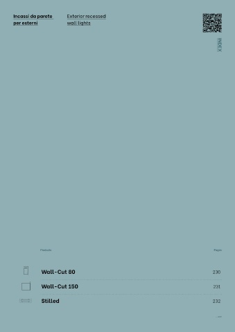 Incassi da parete Exterior recessed per esterni wall lights INDEX Products Pages Wall-Cut 80 150 150 230 74 80 0,6Kg Wall-Cut 150 231 150 150 68 150 1 Kg Stilled 232 60 184 55 1000 Kg 177 0,3 Kg — 229