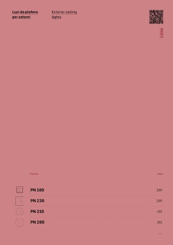Luci da plafone Exterior ceiling per esterni lights INDEX Products Pages 30 180 77 PN 180 280 180 1,2 Kg 36 230 77 PN 230 280 230 30 2,0 Kg 210 PN 210 281 1,2 Kg 36 280 PN 280 281 2,0 Kg 279 —