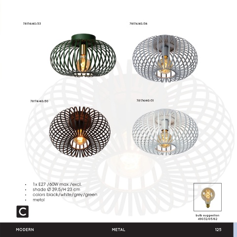 78174/40/33 78174/40/36 MANUELA 78174/40/30 78174/40/31 • 1x E27 /60W max./excl. • shade Ø 39,5/H 23 cm • colors black/white/grey/green • metal bulb suggestion 49032/05/62 MODERN METAL 125