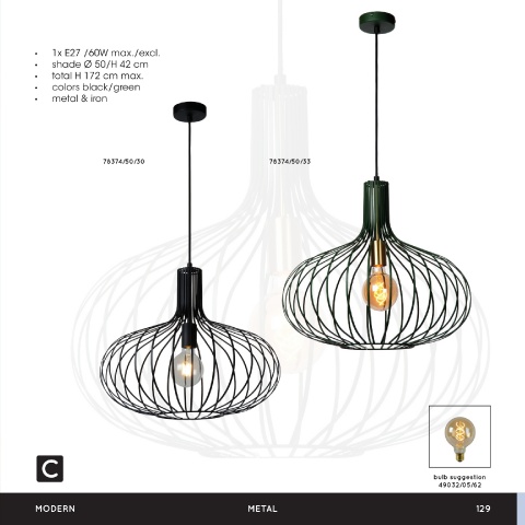 • 1x E27 /60W max./excl. • shade Ø 50/H 42 cm • total H 172 cm max. • colors black/green • metal & iron 78374/50/30 78374/50/33 MANUELA bulb suggestion 49032/05/62 MODERN METAL 129
