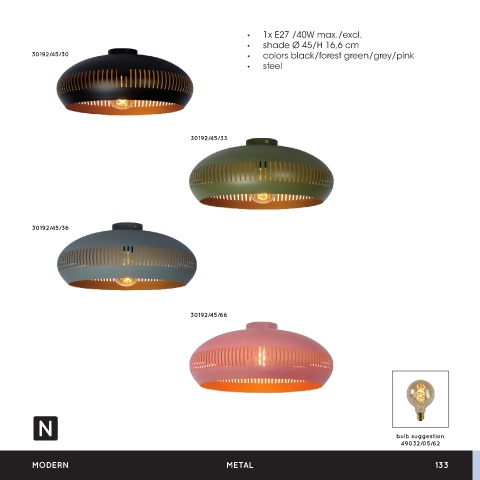 • 1x E27 /40W max./excl. • shade Ø 45/H 16,6 cm 30192/45/30 • colors black/forest green/grey/pink • steel 30192/45/33 RAYCO 30192/45/36 30192/45/66 bulb suggestion 49032/05/62 MODERN METAL 133