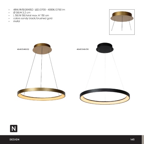 • 48W/INTEGRATED LED/2700 - 4000K/2750 lm • Ø 58/H 3,2 cm • L 58/W 58/total max. H 150 cm • colors sandy black/brushed gold • metal 46403/48/02 46403/48/30 VIDAL DESIGN 145