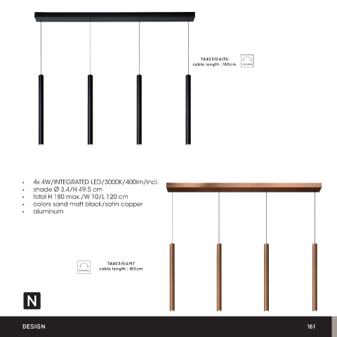 74403/04/30 cable length : 180cm • 4x 4W/INTEGRATED LED/3000K/400lm/incl. • shade Ø 3,4/H 49,5 cm • total H 180 max./W 10/L 120 cm • colors sand matt black/satin copper • aluminum 74403/04/97 LORENZ cable length : 180cm DESIGN 161