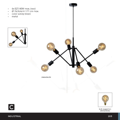 • 6x E27/40W max./excl. • Ø 76/total H 177 cm max. • color sandy black • metal 21424/06/30 LESTER bulb suggestion 49032/05/62 INDUSTRIAL 205