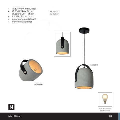 • 1x E27/40W max./excl. • Ø 20/H 24/W 24 cm 20511/01/41 • shade Ø 20/H 26 cm 20411/01/41 • total H 156 cm max. • color concrete & black • concrete & leather COPAIN 20411/01/41 20511/01/41 bulb suggestion 49020/05/67 INDUSTRIAL 219