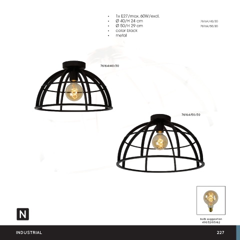 • 1x E27/max. 60W/excl. • Ø 40/H 24 cm 76164/40/30 • Ø 50/H 29 cm 76164/50/30 • color black • metal 76164/40/30 76164/50/30 DIKRA bulb suggestion 49032/05/62 INDUSTRIAL 227