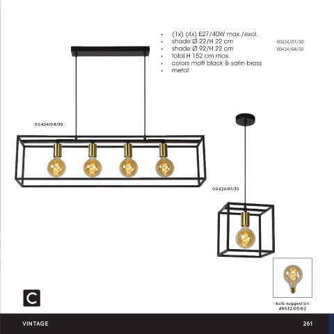 RUBEN • (1x) (4x) E27/40W max./excl. • shade Ø 22/H 22 cm • shade Ø 92/H 22 cm 00424/01/30 00424/04/30 • total H 152 cm max. • colors matt black & satin brass • metal 00424/04/30 00424/01/30 bulb suggestion 49032/05/62 VINTAGE 261