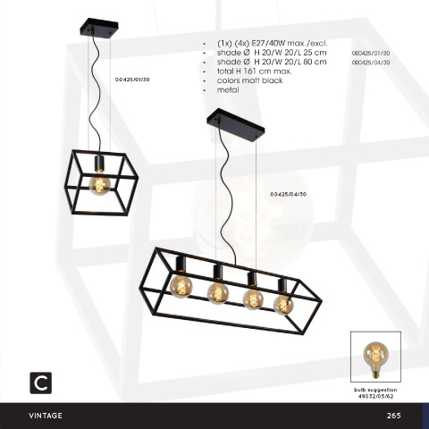 • (1x) (4x) E27/40W max./excl. • shade Ø H 20/W 20/L 25 cm 000425/01/30 • shade Ø H 20/W 20/L 80 cm 000425/04/30 • total H 161 cm max. 00425/01/30 • colors matt black • metal FABIAN 00425/04/30 bulb suggestion 49032/05/62 VINTAGE 265