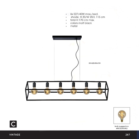 • 6x E27/40W max./excl. • shade H 20/W 20/L 115 cm • total H 170 cm max. • colors matt black • metal FABIAN 00425/06/30 bulb suggestion 49032/05/62 VINTAGE 267