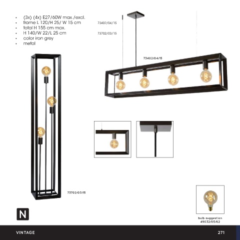• (3x) (4x) E27/60W max./excl. • frame L 120/H 25/ W 15 cm 73402/04/15 • total H 155 cm max. • H 140/W 22/L 25 cm 73702/03/15 • color iron grey • metal 73402/04/15 THOR 73702/03/15 bulb suggestion 49032/05/62 VINTAGE 271