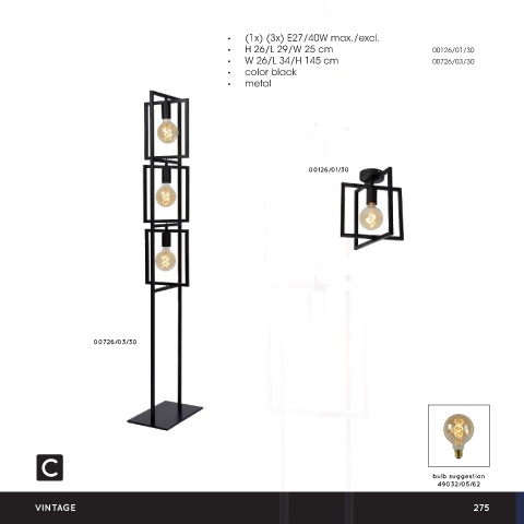 • (1x) (3x) E27/40W max./excl. • H 26/L 29/W 25 cm 00126/01/30 • W 26/L 34/H 145 cm 00726/03/30 • color black • metal 00126/01/30 LUUK 00726/03/30 bulb suggestion 49032/05/62 VINTAGE 275