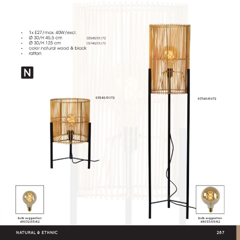JANTINE • • 1x E27/max. 40W/excl. 03540/01/72 Ø 30/H 45,5 cm • Ø 30/H 125 cm 03740/01/72 • color natural wood & black • rattan 03540/01/72 03740/01/72 bulb suggestion bulb suggestion 49032/05/62 49033/05/62 NATURAL & ETHNIC 287