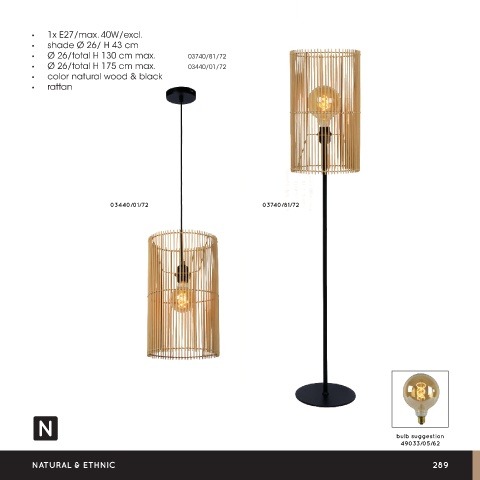 • 1x E27/max. 40W/excl. • shade Ø 26/ H 43 cm • Ø 26/total H 130 cm max. 03740/81/72 • Ø 26/total H 175 cm max. 03440/01/72 • color natural wood & black • rattan 03440/01/72 03740/81/72 JANTINE bulb suggestion 49033/05/62 NATURAL & ETHNIC 289