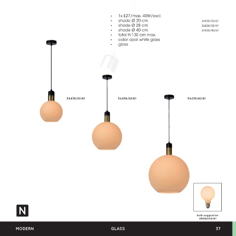 • 1x E27/max. 40W/excl. • shade Ø 20 cm 34438/20/61 • shade Ø 28 cm 34438/28/61 • shade Ø 40 cm 34438/40/61 • total H 130 cm max. • color opal white glass • glass 34438/20/61 34438/28/61 34438/40/61 JULIUS bulb suggestion 49066/08/61 MODERN GLASS 37