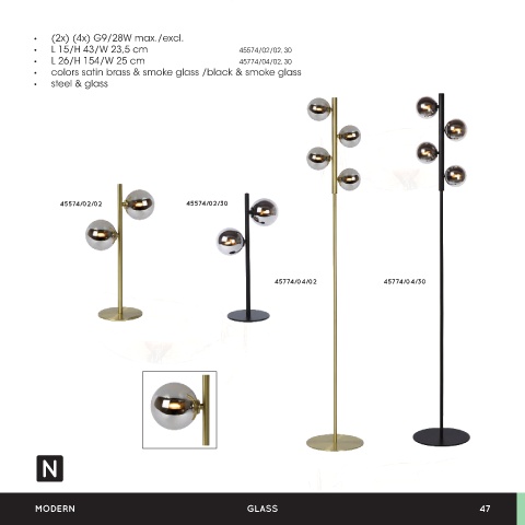 • (2x) (4x) G9/28W max./excl. • L 15/H 43/W 23,5 cm 45574/02/02, 30 • L 26/H 154/W 25 cm 45774/04/02, 30 • colors satin brass & smoke glass /black & smoke glass • steel & glass 45574/02/02 45574/02/30 45774/04/02 45774/04/30 TYCHO MODERN GLASS 47