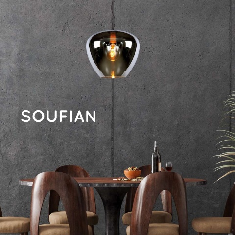 • 1x E27/60W max./excl. • shade Ø 40/H 34 cm • total H 159 cm max. • color smoke • metal & glass SOUFIAN 70478/40/65 bulb suggestion 49033/05/62 MODERN GLASS 53
