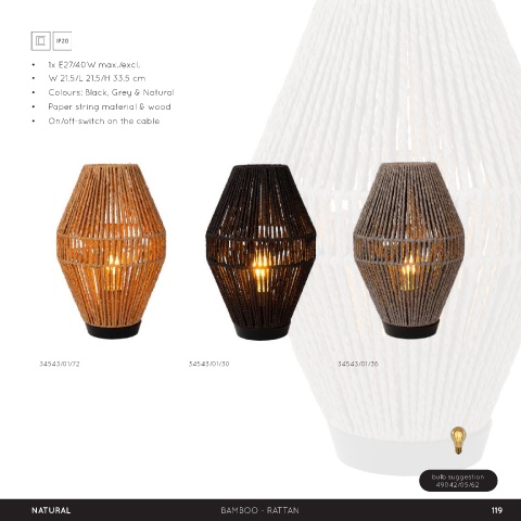 IP 44 • 1x E27/40W max./excl. • W 21.5/L 21.5/H 33.5 cm • Colours: Black, Grey & Natural • Paper string material & wood • On/off-switch on the cable 34543/01/72 34543/01/30 34543/01/36 bulb suggestion 49042/05/62 NATURAL BAMBOO - RATTAN 119