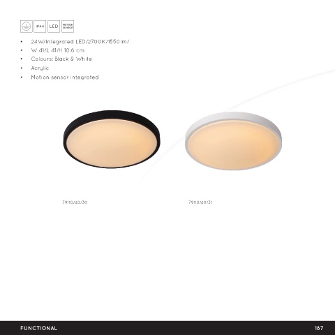 IP 44 • 24W/Integrated LED/2700K/1550lm/ • W 41/L 41/H 10.6 cm • Colours: Black & White • Acrylic • Motion sensor integrated 79110/40/30 79110/40/31 FUNCTIONAL 187