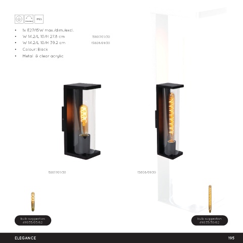IP 44 • 1x E27/15W max./dim./excl. • W 14.2/L 10/H 27.8 cm 15807/01/30 • W 14.2/L 10/H 39.2 cm 15808/01/30 • Colour: Black • Metal & clear acrylic 15807/01/30 15808/01/30 bulb suggestion bulb suggestion 49035/05/62 49035/30/62 ELEGANCE 195