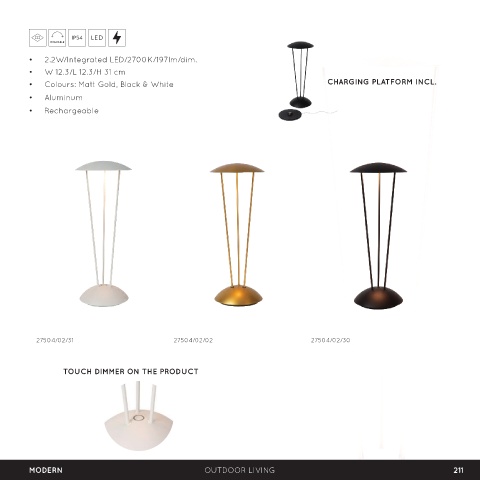 • 2.2W/Integrated LED/2700K/197lm/dim. • W 12.3/L 12.3/H 31 cm • Colours: Matt Gold, Black & White CHARGING PLATFORM INCL. • Aluminum • Rechargeable 27504/02/31 27504/02/02 27504/02/30 TOUCH DIMMER ON THE PRODUCT MODERN OUTDOOR LIVING 211