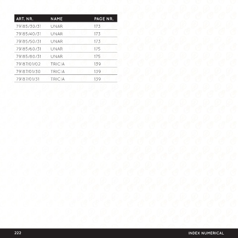 ART. NR. NAME PAGE NR. 79185/30/31 UNAR 173 79185/40/31 UNAR 173 79185/50/31 UNAR 173 79185/60/31 UNAR 175 79185/80/31 UNAR 175 79187/01/02 TRICIA 139 79187/01/30 TRICIA 139 79187/01/31 TRICIA 139 222 INDEX NUMERICAL