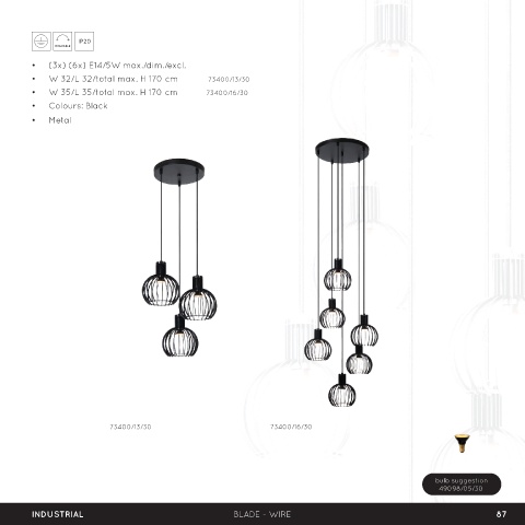 IP 44 • (3x) (6x) E14/5W max./dim./excl. • W 32/L 32/total max. H 170 cm 73400/13/30 • W 35/L 35/total max. H 170 cm 73400/16/30 • Colours: Black • Metal 73400/13/30 73400/16/30 bulb suggestion 49098/05/30 INDUSTRIAL BLADE - WIRE 87