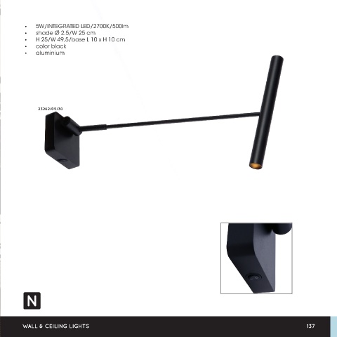 WYGO • 5W/INTEGRATED LED/2700K/500lm shade Ø 2,5/W 25 cm • • H 25/W 49,5/base L 10 x H 10 cm • color black • aluminium 23262/05/30 WALL & CEILING LIGHTS 137