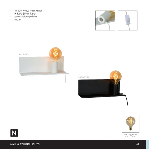 • 1x E27 /40W max./excl. • H 12/L 35/W 12 cm SEBO • colors black/white • metal 06218/01/31 06218/01/30 bulb suggestion 49032/05/62 WALL & CEILING LIGHTS 167