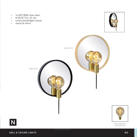 REFLEX • 1x E27/25W max./excl. H 33/W 12/L 31 cm. • • wood & mirror • colors black/light wood 36213/31/72 36213/31/30 bulb suggestion 49032/05/62 WALL & CEILING LIGHTS 183