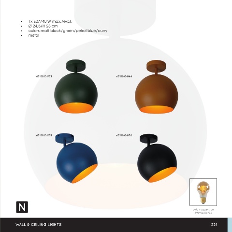 • 1x E27/40 W max./excl. • Ø 24,5/H 28 cm • colors matt black/green/petrol blue/curry • metal BINK 45150/01/33 45150/01/44 45150/01/35 45150/01/30 bulb suggestion 49042/05/62 WALL & CEILING LIGHTS 221