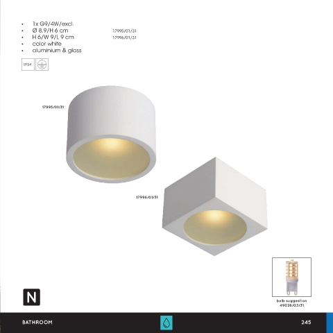 • 1x G9/4W/excl. • Ø 8,9/H 6 cm 17995/01/31 LILY • H 6/W 9/L 9 cm 17996/01/31 • color white • aluminium & glass IP 44 17995/01/31 17996/01/31 bulb suggestion 49026/03/31 BATHROOM 245