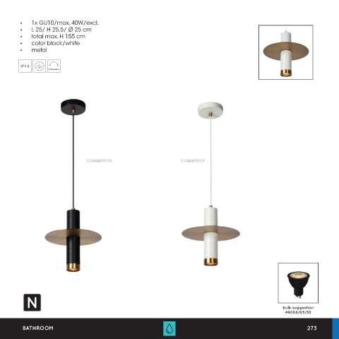 • 1x GU10/max. 40W/excl. • L 25/ H 25,5/ Ø 25 cm • total max. H 155 cm • color black/white SELIN • metal IP 44 03444/01/30 03444/01/31 bulb suggestion 49006/05/30 BATHROOM 273