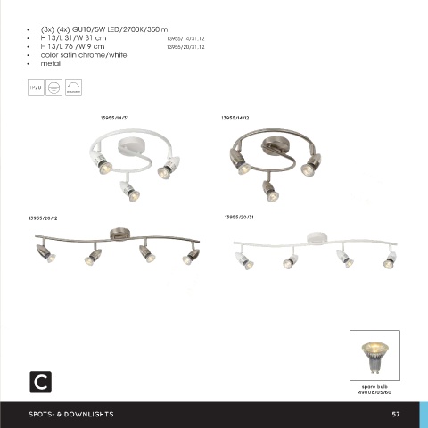 • (3x) (4x) GU10/5W LED/2700K/350lm • H 13/L 31/W 31 cm 13955/14/31,12 CARO • H 13/L 76 /W 9 cm 13955/20/31,12 color satin chrome/white • metal • IP 44 13955/14/31 13955/14/12 13955/20/12 13955/20/31 spare bulb 49008/05/60 SPOTS- & DOWNLIGHTS 57