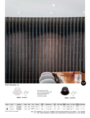 Photo Code Material Watt Volt mA Lumen Chip Dimension (cm) Cut CRI UGR Beam Kelvin IP Adj. Included Dim. Class LUELA 9113777 LUELA 9113778