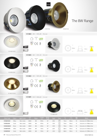 10108D/W/W White Warm white 3000K 8W 600lm 36° 230V 73mm 90mm 50 Complete with 300mA driver