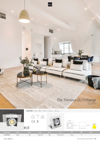 The Trimless GU10 Range Square 51010TR | 10W | MR16 | GU10 | Trimless | Die cast 89mm 89mm 110mm Order Code Colour Watts Input Class Notes 51010TR/W White 10W 100-240V 97,5x97,5mm 150mm 16 - www.1-light.eu Recessed Spots Adjustable < 118