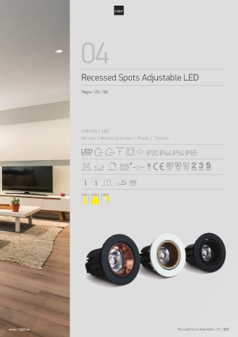 04 Recessed Spots Adjustable LED Pages 123-158 COB LED | LED Die cast | Natural aluminium | Plastic | Trimless www.1-light.eu Recessed Spots Adjustable LED < 122