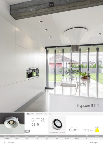 Gypsum R111 11110GT1 | 75W | R111 | G53 | Gypsum 210mm 67mm Suitable for R111 LED lamp. Order Code Colour Watts Input Class Notes 11110GT1 White 75W 12V 25cm 212mm 170mm 6 - 167 > Downlights www.1-light.eu