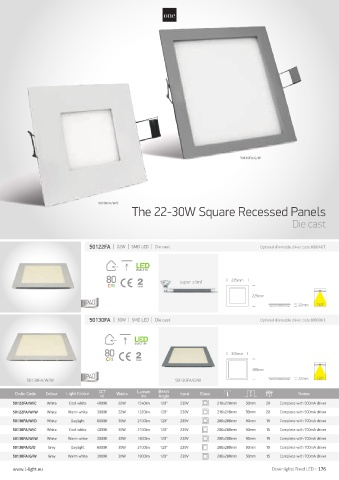 50130FA/W/C White Cool white 4000K 30W 2100lm 120° 230V 280x280mm 50mm 15 Complete with 700mA driver