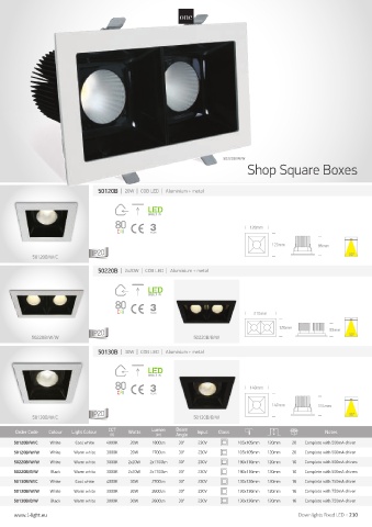 50220B/W/W White Warm white 3000K 2x20W 2x1700lm 30° 230V 190x110mm 120mm 10 Complete with 500mA drivers