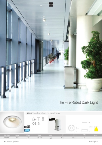 The Fire Rated Dark Light 10109F | 10W | MR16 | GU10 | Fire Rated | Die cast 124mm 85mm Order Code Colour Watts Input Class Notes 10109F/W White 10W 100-240V 73mm 160mm 30 - 29 > Recessed Spots Fixed www.1-light.eu