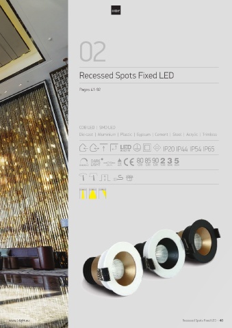 02 Recessed Spots Fixed LED Pages 41-92 COB LED | SMD LED Die cast | Aluminium | Plastic | Gypsum | Cement | Steel | Acrylic | Trimless www.1-light.eu Recessed Spots Fixed LED < 40