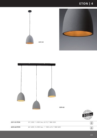ETON | 4 2231-22 2233-22 2231-22 ETON E27, 230V, 1 x 40W max., 210, ¢ 800-1200 ç 2233-22 ETON E27, 230V, 3 x 40W max., 1000 x 210, ¢ 800-1200 ç 231